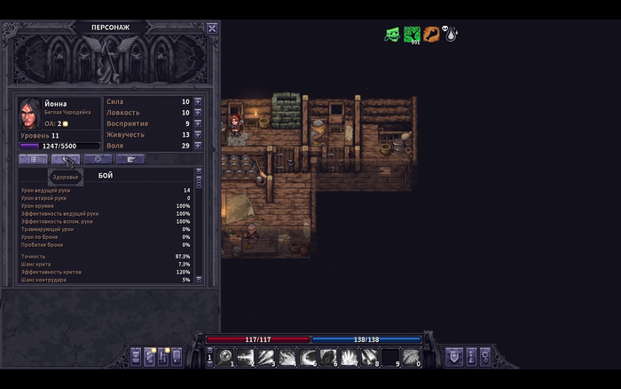 В зависимости от этих двух шкал и серии действий персонажа он получает определённое состояние, например при крайне низкой морали получив серьёзный урон персонаж может впасть в бешенство: