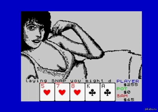 STRIP POKER. Мне было 12, меня вообще не интересовали девушки, меня интересовало ПОБЕДИТЬ (читай-раздеть). Так вот, начальный интерфейс представлял из себя подобие карты города. Там была офисная работница, полицейская, две каких-то девушки, пожарница...