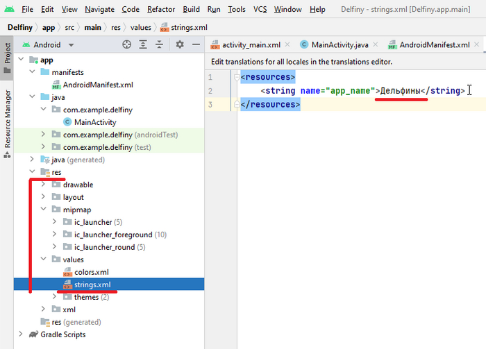 Как назвать/изменить название приложения в Android Studio? Название приложения кириллицей/русскими буквами