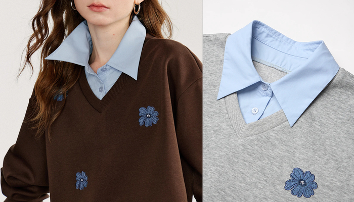 Женский свитшот с цветочным принтом. Свитер с V-образным вырезом, аккуратный и стильный. Акцентом являются цветы в виде вышивки. Три цвета и четыре размера на выбор. Материал: хлопок, полиэстер.