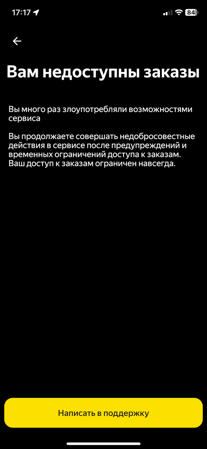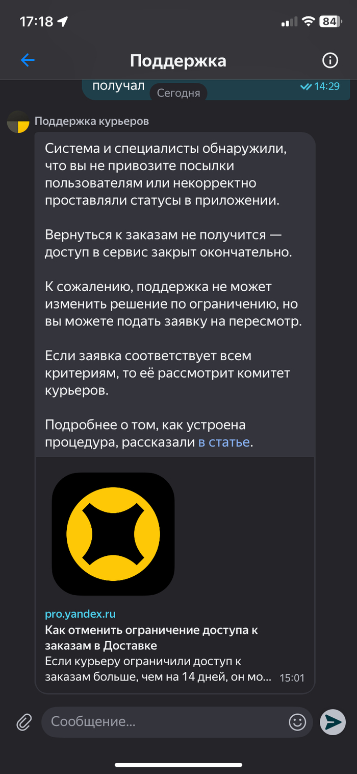 Добрый вечер , я работаю курьером компании Яндекс Про в общей сложности 6 дней, за это время никаких проблем с заказами у меня не было , все заказы доставлял согласно стандартам компании и инструкциям по передачи посылок, даже успел заработать рейтинг 5 звезд. Сегодня увидел , что меня навсегда заблокировали на Яндекс Про. Как выяснилось из-за одной нелепой ситуации. 18.11.2025 г. Я выполнил заказ (как указано в приложении Яндекс Про, номер 14 , тариф Экспресс), где вез продукты весом менее 1кг с магазина Вкусвилл на адрес литейный проспект ( номер дома увы не помню), подъехал, припарковался, прочитал условия передачи посылки, там было указано «от двери до двери» , но в разделе особые условия так-же была пометка о том, что если получатель не выходит на связь, посылку необходимо оставить у двери. Вполне обычные условия , далее я попытался пройти во двор к подъезду , но везде было заперто, звонок от ворот в квартиру не проходил, я позвонил получателю с вопросом прохода , на территорию, она мне подсказала, далее, зайдя на территорию двора я подошел к ее подъезду, позвонил с домофона на номер квартиры, который был указан в приложении моей доставки, она ответила и открыла мне дверь. Я поднялся на этаж, подошел к двери , постучал в нее и достал посылку, никто дверь не открыл, я постучал еще, подождал , но снова никто не открыл, так как в условиях было написано на такой случай оставить у двери, я так и сделал , оставил посылку у двери, сфотографировал как было написано в инструкции передачи посылки в приложении, успешно выполнил заказ , соблюдая все условия и руководствуясь правилами, далее покинул дом, выполняя другую доставку.