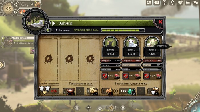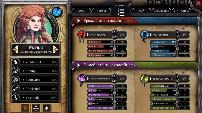 Большое влияние на все навыки оказывают шкалы состояний : болезнь, голод, ранения, усталость и уныние. По большому счету они указывают на то, как хорошо вы заботитесь о своих "томагочах". Если герой поранился на охоте, у него откроется кровотечение, увеличивающее шкалу ранений. Чем она выше, тем более уменьшает удачное применение его черт. Как только показатель заполнится, герой помрет. И, если в случае с присоединившимися в процессе персонажами это чревато лишь потерей работника и эмоцией из разряда "птичку жалко", то смерть кого-то из основного костяка игру продолжить не даст.