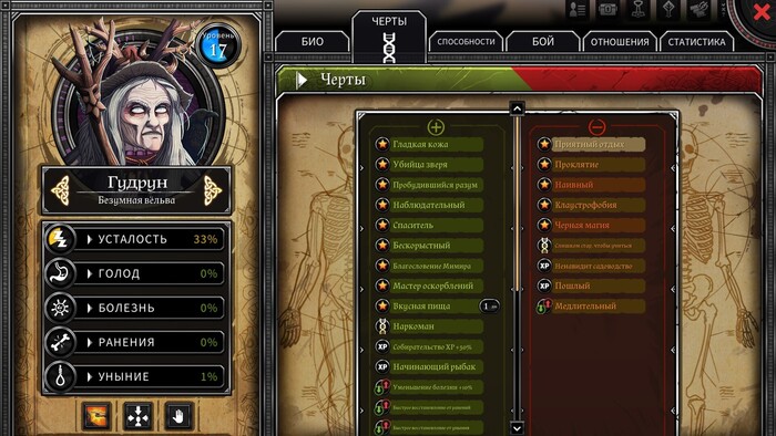 Другой аспект личности каждого "робинзона" - его черты. Это список постоянных или временных эффектов, получаемых от ошибок и успехов героя в процессе прохождения. Не хватило ума на решение головоломки? Расстроился, словил "депрессию",а значит на несколько дней получаешь штраф к характеристикам.