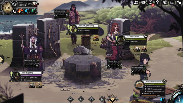 По хозяйству придется делать много. Игровой процесс разделен на три фазы. Первые две - дневные, в ходе них игрок может заниматься добычей ресурсов, развитием поселения и открытием точек на острове. Перед началом нового дня игра подскажет, каких эффектов следует ожидать : дождливая погода портит настроение героям, а так же может повредить ваши постройки, жара повышает усталость и т.п. Подобные прогнозы позволяют расставлять приоритеты и планировать дневные активности.