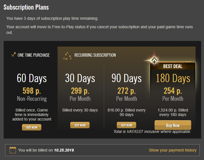 В "RECURRING SUBSCRIPTION" выбираем план подписки - ежемесячный/квартальный/полугодичный, оформляем на него подписку - рекомендую брать последний (в зависимости от выбранного плана вы дополнительно получите внутриигровую валюту, и за полугодовой план ее дают больше).