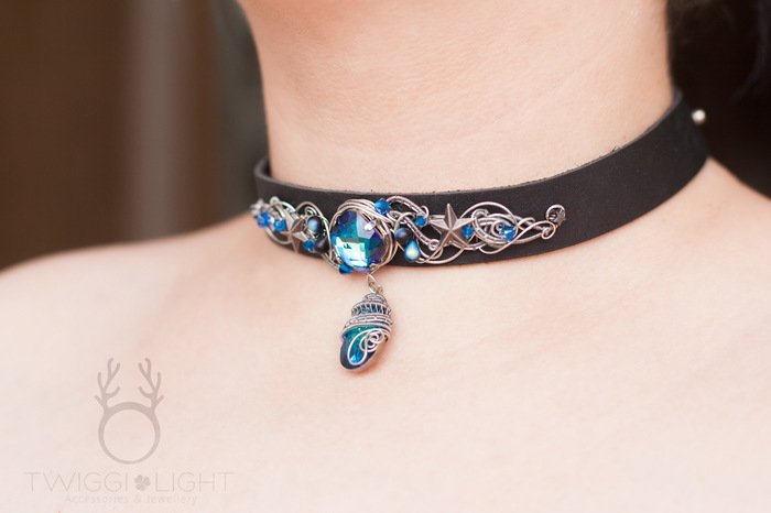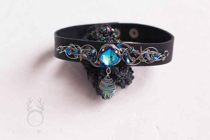 Чокер, который сверкает за километр :)) Кожаная основа от TmTiger, украшена уже мной: медная проволока, кристаллы и бусины Swarovski, винтажная фурнитура и немного чешского стекла.