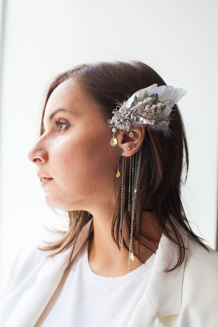 Самый масштабный, пожалуй, проект июля. Кафф с перьями, алюминиевой чешуёй, стеклом, кристаллами Swarovski и медной проволокой :)