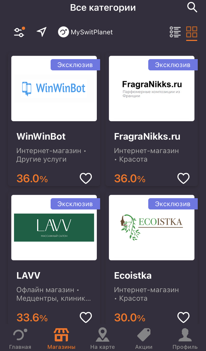 — Больше всего магазинов-партнеров MySwitPlanet представлено в онлайн формате, а также в офлайн, но в крупных городах. В маленьких городках ощутимая выгода от использования приложения будет при онлайн-заказах. Офлайн пока под сомнением.
