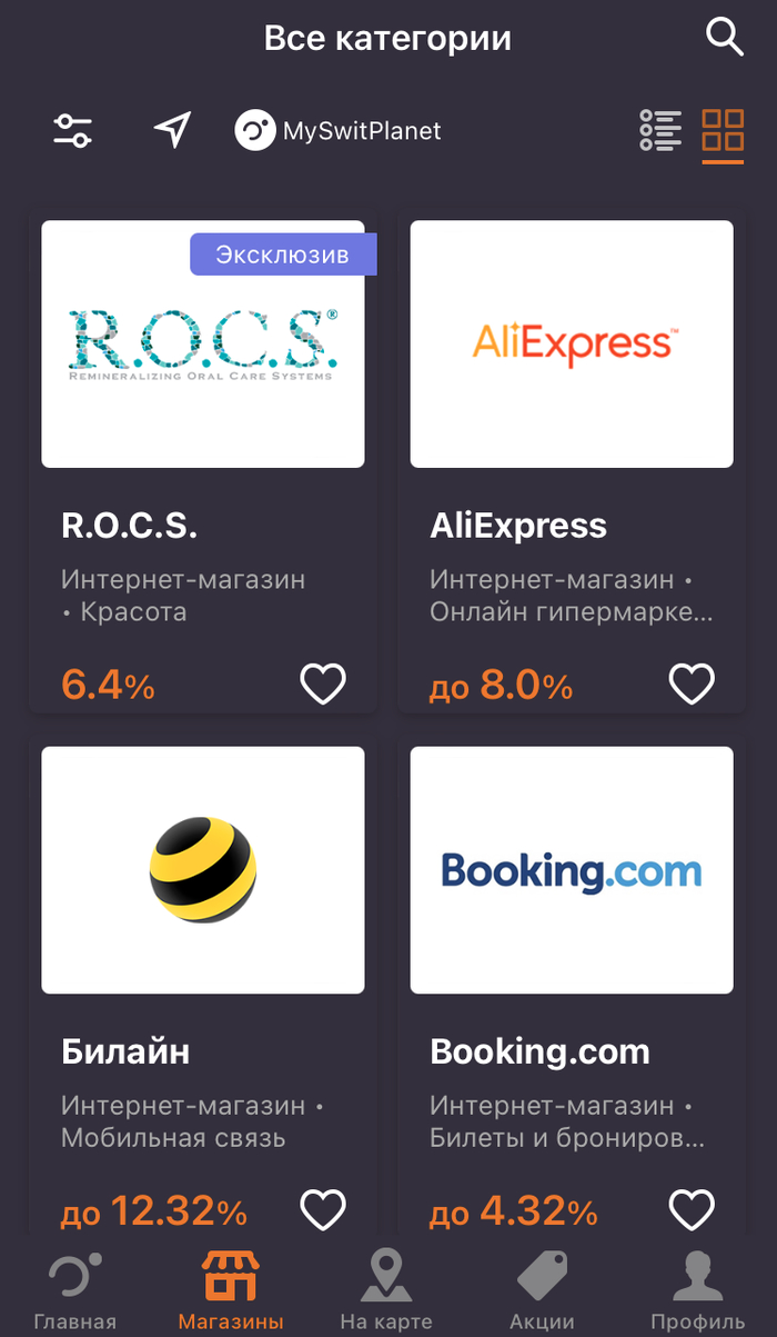 Внимание. Не все офлайн-магазины сети могут быть партнерами MySwitPlanet. И кэшбэк начисляют только от покупки в тех точках, которые подключены к системе приложения.