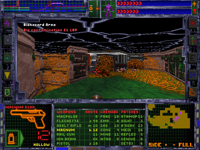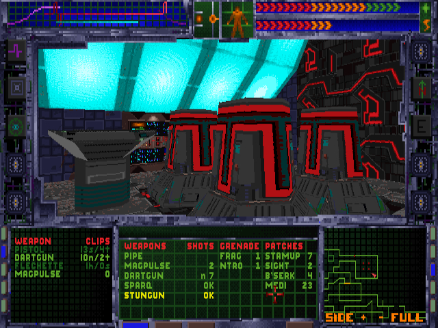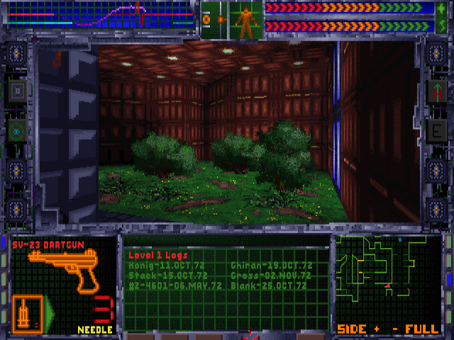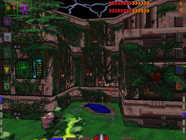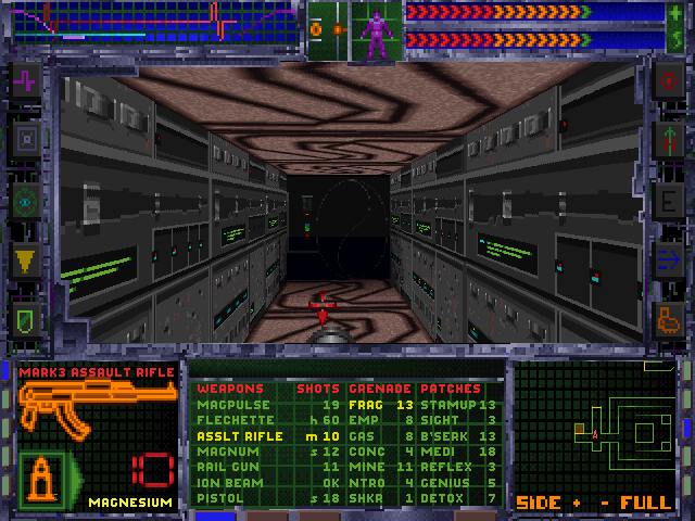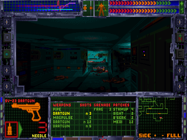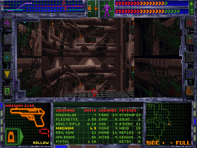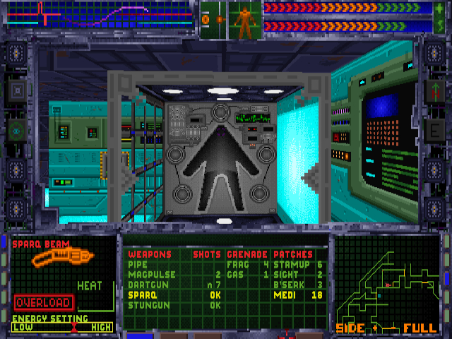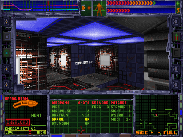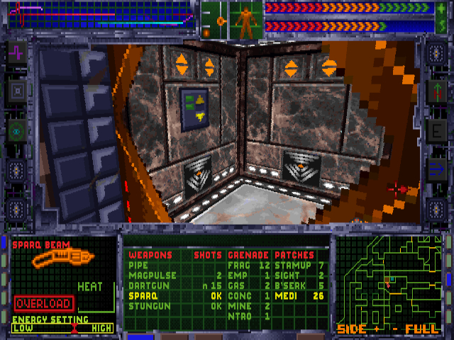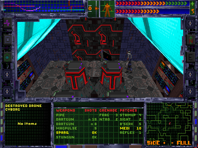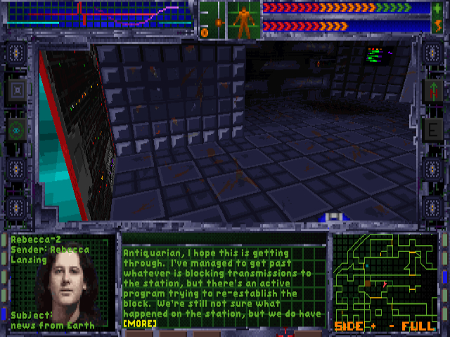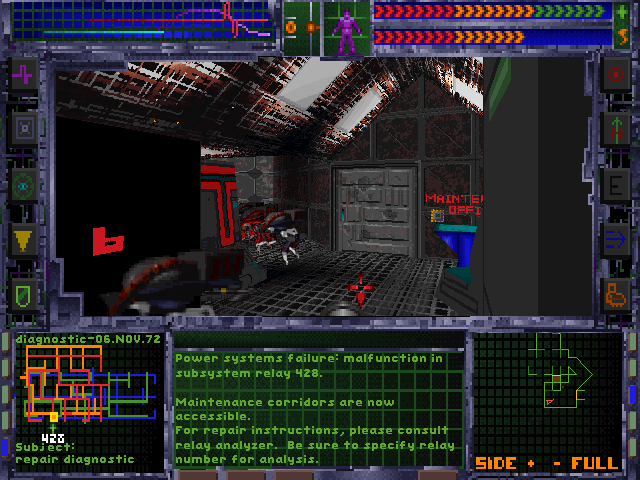Из нашего отряда лишь я один остался в живых. Все остальные мертвы или превращены в киборгов. Это чудовище SHODAN теперь устроила себе дворец на Мостике. Я должен добраться туда и найти главный кибер-терминал. Пока что мне удалось подняться только до Инженерного уровня. Что там творится... Уровень похож на большой лабиринт, но, кажется, есть способ пробраться: если захватить центральный хаб, оттуда можно будет попасть в любую точку уровня.
