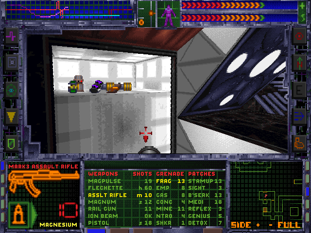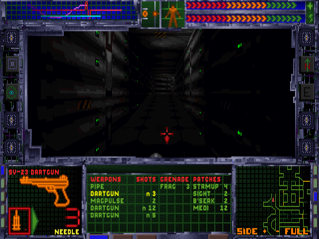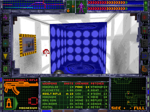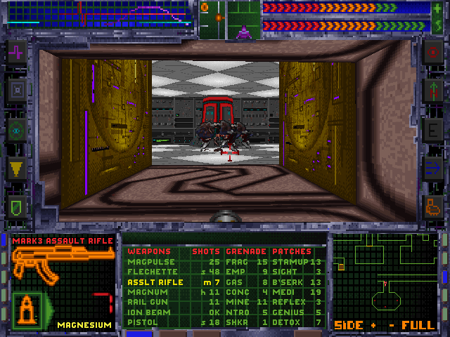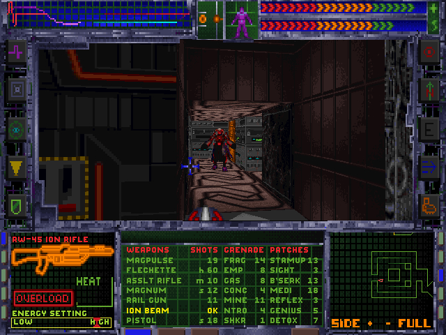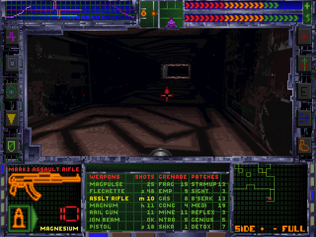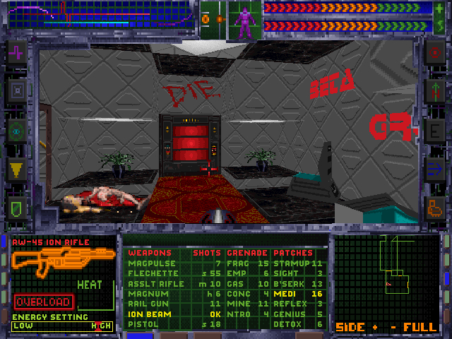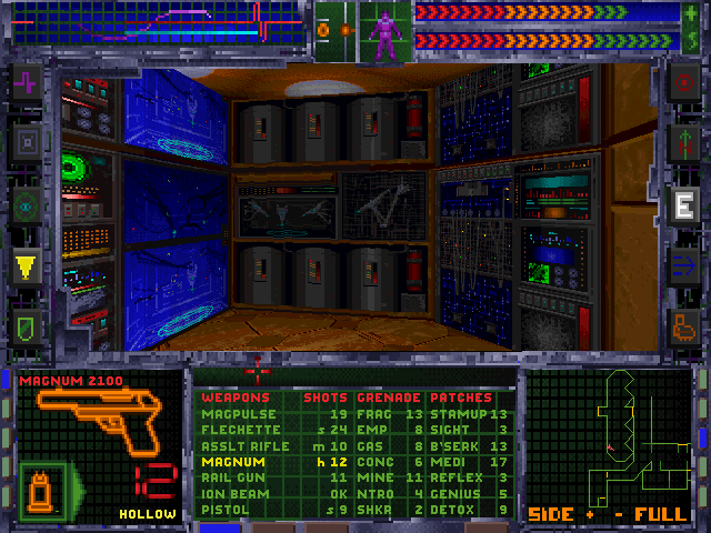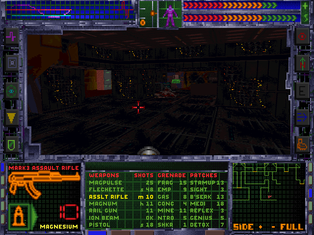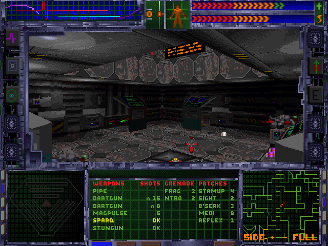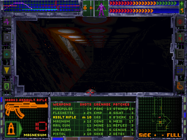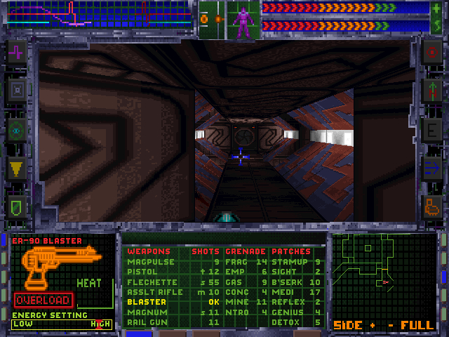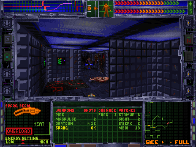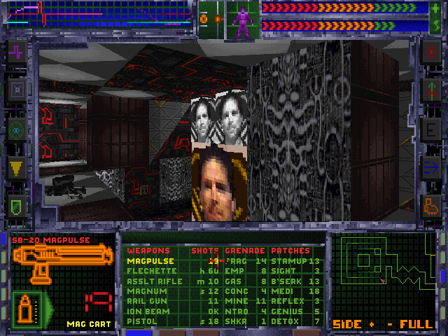 Из нашего отряда лишь я один остался в живых. Все остальные мертвы или превращены в киборгов. Это чудовище SHODAN теперь устроила себе дворец на Мостике. Я должен добраться туда и найти главный кибер-терминал. Пока что мне удалось подняться только до Инженерного уровня. Что там творится... Уровень похож на большой лабиринт, но, кажется, есть способ пробраться: если захватить центральный хаб, оттуда можно будет попасть в любую точку уровня.