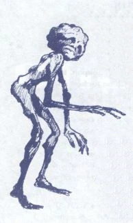 Он быстро пошёл на меня, высокий, на невероятно длинных, деформированных ногах, отчего его тело раскачивалось, а одна стопа волочилась по земле. Его длинные руки свисали ниже колен. Большая голова была сплошным бесформенным наплывом светло-коричневой плоти. На тощем теле во многих местах краснели отвратительные сочащиеся нарывы.