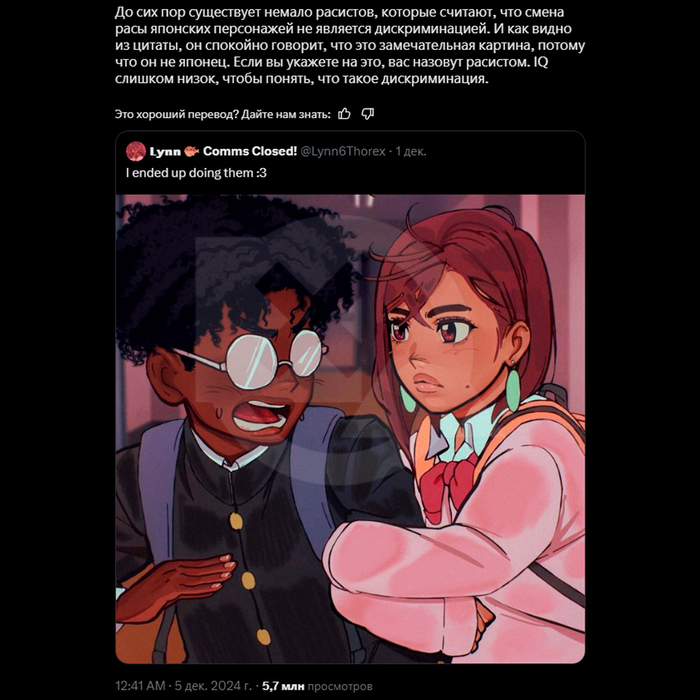 Картинка, опубликованная художницей, набрала около 70 миллионов просмотров. Вместо ожидаемых положительных комментариев, она столкнулась с волной критики от японских комментаторов, которые обвинили её в расизме.