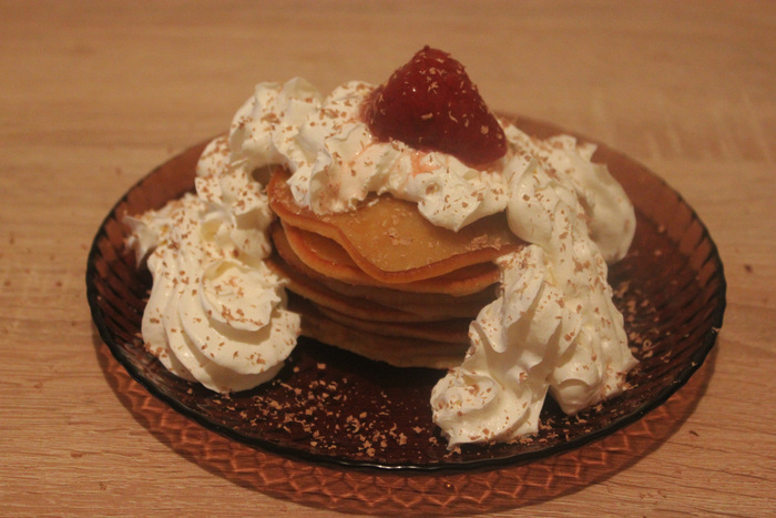 Казалось бы, что может быть проще чем оладьи, да? Конечно, сам по себе, рецепт очень простой и во всех фейлах в процессе приготовления виноват я сам. Но, честно говоря, итоговый вкус оказался изумительный! Я утаил главную фишку блюда от родных и отдавая оладьи на дегустацию, они не ожидали увидеть от тонких оладушек карамель в центре, да еще и с необычной остринкой. На самом деле, все эти фокусы со слоями теста/карамели вовсе необязательны и нужны лишь для этакого ВАУ-эффекта. Если не хотите заморачиваться, можете просто вмешать карамель в само тесто. Вкус от этого никуда не денется. Также, судя по всему, Шион использовала мороженое вместо взбитых сливок. Я решил этот момент переиграть. Во-первых, взбитые сливки всегда придают красоты. Во-вторых, фишку с мороженым я оставил на другой пост, который обязательно состоится когда-нибудь в будущем. Напоминаю, что в квесте с оладьями было три участника. Ну и вершинка нашей "башни" - клубника. У меня не было понимая, что конкретно использовала Шион на украшение. Похоже на конфету или типа того. Я решил, что клубника подойдет к этому десерту идеально и использовал ту, что была в доступности, а именно консервированную. Не сомневаюсь, что свежая клубника еще больше украсит этот десерт и порадует вас и ваших близких.