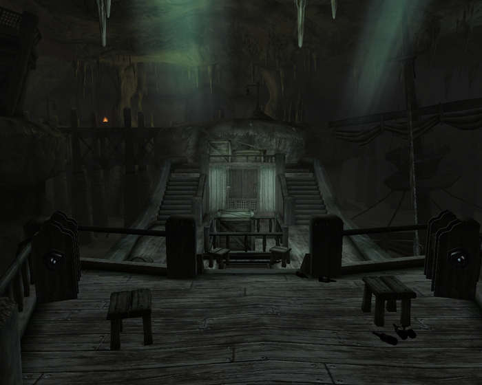Оказываемся сразу в главном зале святилища. Интерьер в очень хорошей сохранности, но в центре традиционной статуи нет, видимо, оно никому конкретно из Принцев не посвящено. Вместо статуи на возвышении торчит, похоже, владыка дремора, который заметив нас, напрягается в касте и выдает офигенный фаербол. Пока шар летит, успеваем уклониться. Дремора соображает, что на дальнем расстоянии и у магии есть свои минусы, и устремляется к нам. Мы тоже устремляемся, но вдоль стеночки, вкруговую. Пускай порастратит пока энергию, а мы слегка осмотримся на бегу.