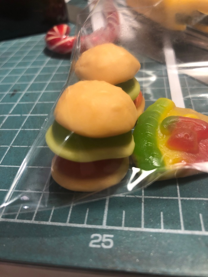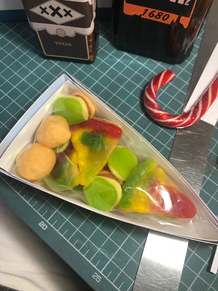 К сэндвичу мы также постарались найти оригинальный подход. В картонную упаковку мы вложили небольшие мармеладные бургеры и кусочки пиццы.