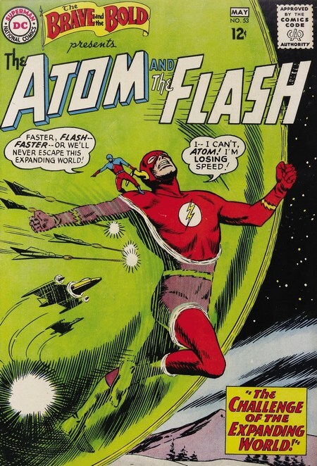 К супергероической теме возвращается комикс The Brave and the Bold #53. Флэш (Барри Аллен) сталкивается с несколькими здоровенными монстрами, которые терроризируют окрестные города. Алый Скороход их, конечно, побеждает, но возникают вопросы: откуда они, собственно, взялись? Да ещё в таком количестве, что даже Султан Скорости уже с ног сбивается и сомневается, что сдюжит ещё один подвиг без передышки. В это время где-то поодаль видный учёный доктор Стентон зовёт на помощь Атома (Рея Палмера), специалиста по маленьким проблемам. Он нашёл странную зелёную сферу, и никак не может раскрыть её тайны. А всё потому что (уч0ные, не бейте, передаю, как есть) один из атомов этой сферы потерял электрон и сфера “заперлась”. Чтобы раскрыть её тайны, Атом должен временно заменить собой пропавший электрон. Но для этого нужна некислая скорость... тут-то в лабораторию и заглядывает Флэш, испросить у учёного совета. Атом уменьшается, и Флэш на суперскорости отправляет его в зелёную сферу...после чего получает сзади по голове и теряет сознание.