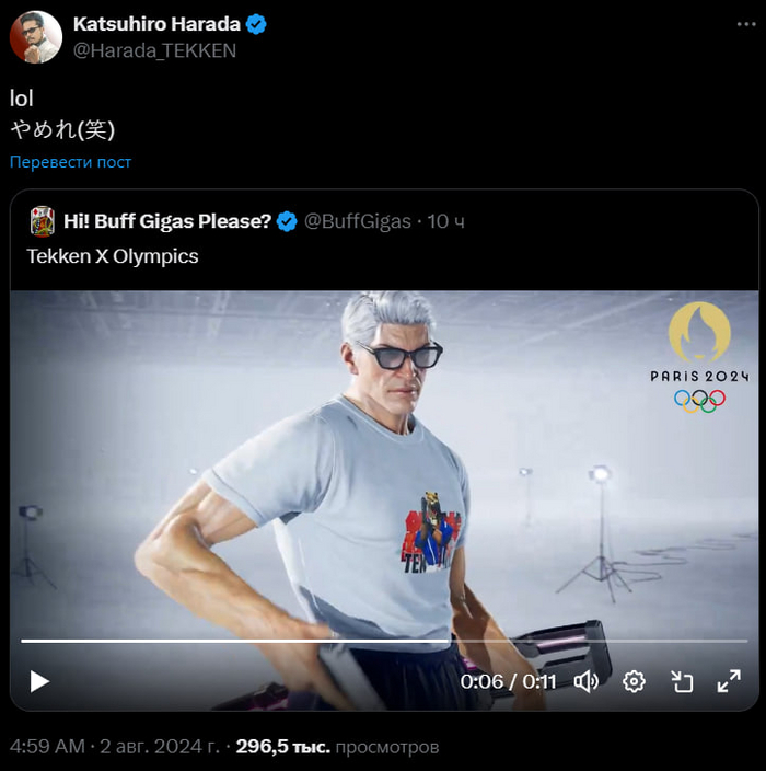 Харада репостнул и оценил игровую сцену в Tekken, в которой геймеры создали Юсуфа.