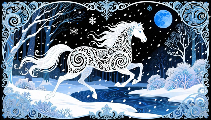 Vector, online art miniature. A planar solution. Long-maned and long-tailed openwork white horse, made with openwork ornamental zentangle lines. In the neo-Rococo style. It rushes against the background of a winter midnight landscape: a snow-covered forest, a river, delicate branches of trees and lush bushes in frost, a blue moon. Dark background with thin white and blue lines, imitating a blizzard. Detailed, realistic, beautiful, detailed to the smallest detail line art. A complex composition in the Baroque and neo-Rococo style. Bends, spirals. Background with snowflakes and frosty patterns in Rococo style. Artistic improvisation. Stylistics: Gothic, Baroque, Rococo, surrealism, abstraction, complex ornament, fairy tale, fantasy. In the manner of Vladislav Yerko, Andrew Jones, Aubrey Beardsley, Alphonse Mucha and Georges Barbier. High quality and detailed design.