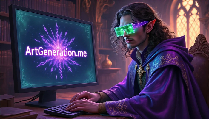 Close-up, oil painting, ink strokes, with elements of impressionism. An attractive young wizard in neon rectangular HUD glasses in purple-green tones, in a long iridescent cloak with shimmering runic patterns, with aristocratic features and curly long hair carelessly combed back, sits in front of a monitor in a presentable epic office in the style of medieval fantasy. He's staring at the screen with his hands on the keyboard. On the monitor is a splash screen with a large neon inscription: "ArtGeneration.me "; The text occupies the central part of the screen, is made in an elegant Gothic font with edging and detailed elements, glows with a soft bluish-greenish light on a gradient background of the screen in a cosmic style with the inclusion of bright fireworks. The contrast and clarity of the label make it easy to read the text. Muted cinematic lighting, twilight. High detail, wide angle lens.