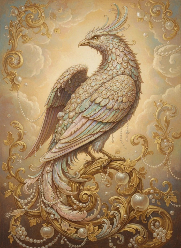 (Masterpiece:1.8). luxurious fantasy bird with iridescent mother-of-pearl feathers, intricately detailed with golden outlines and adorned with pearls of various sizes. The bird is surrounded by ornate golden swirls and delicate pearl decorations, set against a soft warm background. The lighting is soft and glowing, emphasizing the shimmering texture of the feathers and the metallic gold accents. The style is a blend of Baroque and Rococo, featuring elaborate ornamental details, flowing curves, and a rich, elegant atmosphere. Include elements like pearlescent apples and golden leaves to enhance the opulent and magical feel. Highly detailed, hyper-realistic, with a focus on texture, light reflection, and intricate craftsmanship.
