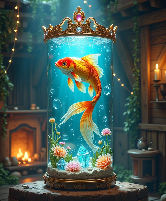 Realistic goldfish queen inside a crystal-clear cylindrical aquarium, wearing a jeweled royal crown and pearl necklace. The aquarium is filled with glowing colorful crystals and bubbles, surrounded by ancient underwater ruins with ornate columns. Magical light rays illuminate the water, creating a mystical and enchanting atmosphere. The aquarium is placed inside a rustic wooden cabin with warm fireplace light, fishing nets, wooden furniture, and old-fashioned lanterns, evoking a cozy fairy-tale ambiance. Soft volumetric lighting highlights the fish and crystals, blending fantasy and realism.