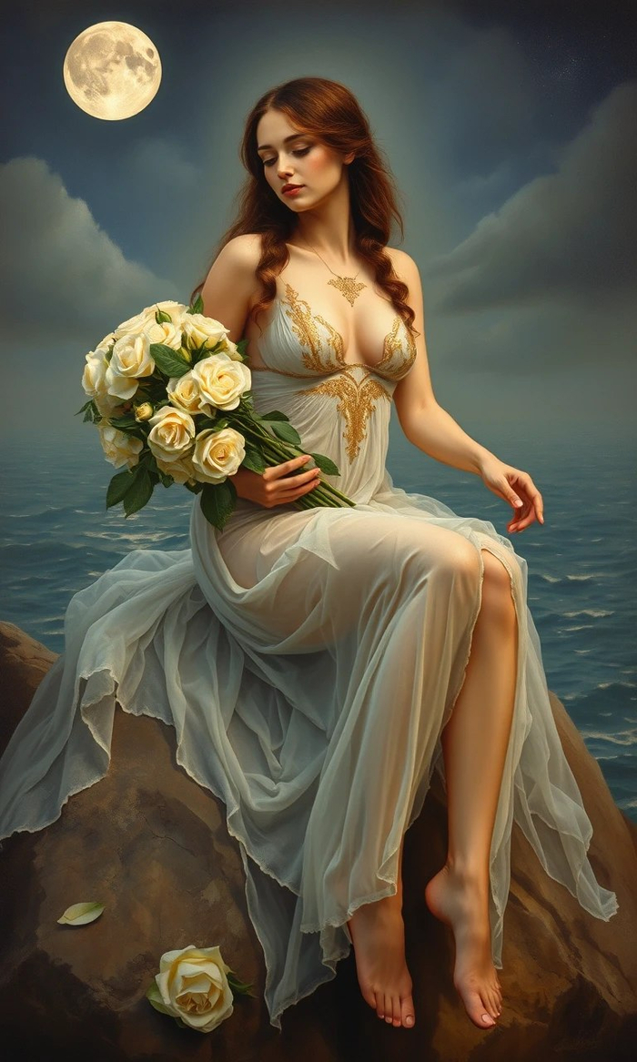 A masterpiece. A semi-naked naiad in a white thin semi-transparent dress with gold ornaments gracefully sits on a large stone by the sea in the moonlight with a beautiful bouquet of white roses. The style of Rfafael, Van Dyck, Durer. The perfect composition of the figures is made in accordance with the rules of the Golden ratio and in the style of classical Renaissance painting. Oil painting with professional paste strokes on canvas. High resolution. Attention to small details. Close-up.