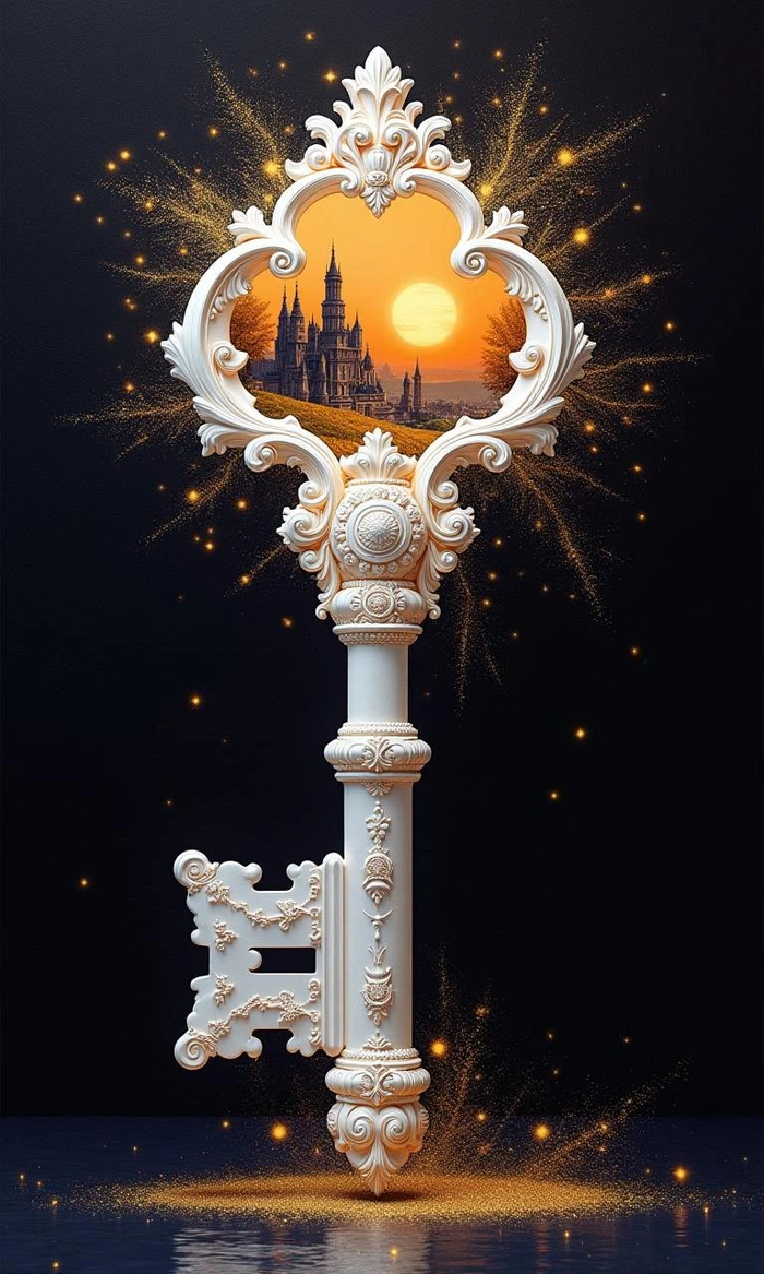 Highly detailed digital image. (In the style of layering and double exposure, close-up:1.3). A majestic ornate key in the center of the composition, a glossy white surface with intricate Baroque patterns surrounded by a cascade of shining golden rays, a dark purple background, an unearthly landscape of the rising sun at the top of the key depicting a magical palace with Rococo architecture, fantasy elements, surrealism, high detail, 8K, digital painting, cinematic lighting, stunning composition, artstation trend, volumetric lighting, depth of field, professional photography, octane rendering, magical atmosphere, otherworldly beauty, ultra-detailed textures, advanced shading technology, spectacular lighting, lens glare, motion blur, depth of field, best quality.