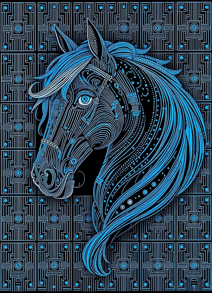 Double exposure. Vector art miniature. A planar solution. black-white-blue graphics. The entire space is filled with identical squares, each of which is filled with its own graphic pattern of stripes, grids, dots, strokes, circles, and so on. Together, they create a stylized image of a horse's head. In the style of op art in the manner of Victor Vasareli's works. Abstract, ultra-modern and unusual. Dark background with thin white and blue guilloche lines. Detailed, realistic, beautiful, worked out to the smallest detail line art. A complex composition in the Baroque and Rococo style. Bends, spirals. Artistic improvisation. Surrealism, abstraction, complex ornament. High quality and detailed design..An exciting masterpiece. Highest quality, high resolution, Iridescent blue. Intricate patterns.