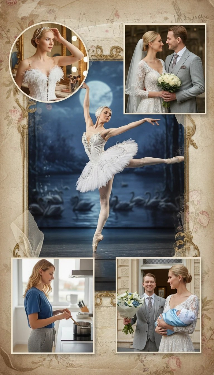 A collage of five photos.hyperrealism. PHOTO 1 in the center is a full-length dancing actress, in flight, in the splits, Odette from the ballet "Swan Lake", with a soulful face, in the image of a heroine dancing on stage.fair-haired, slightly upturned nose, small mouth of regular shape.Photo 2: in the upper right corner: a blonde-haired woman with a man at the registry office, in a white dress, a beautiful veil, with a small bouquet of flowers, the groom in a light gray suit, with a tie, looks tenderly at the bride. Photo 3: in the upper left corner: a woman in the dressing room at the mirror adjusts her hair before going on stage.She is dressed like Odette from the ballet "Swan Lake" in photo 4: in the lower right corner: a 35-year-old blonde with her hair in a bun, slender, comes out with a baby in her arms, the baby is wrapped in a blue satin blanket with a white corner. the husband with flowers is waiting for Photo 5: lower left corner: a blonde in slippers, a blue T-shirt and sweatpants, elegant, slender, hair loose over her shoulders, wavy, standing in the kitchen by the stove, a pot on the stove, a spoon in her hand, a woman stands sideways to the camera, her face turned into a semi-profile. There is a large photo in the center, small but clear pictures in the corners, and the overall image is taken from a photo album. It is a creative, realistic and aesthetically appealing work. hyperrealism, hyperdetalization of the face of a 35-year-old woman, high resolution, 4K, Ultra HD.Sfumato, glossy, a masterpiece.