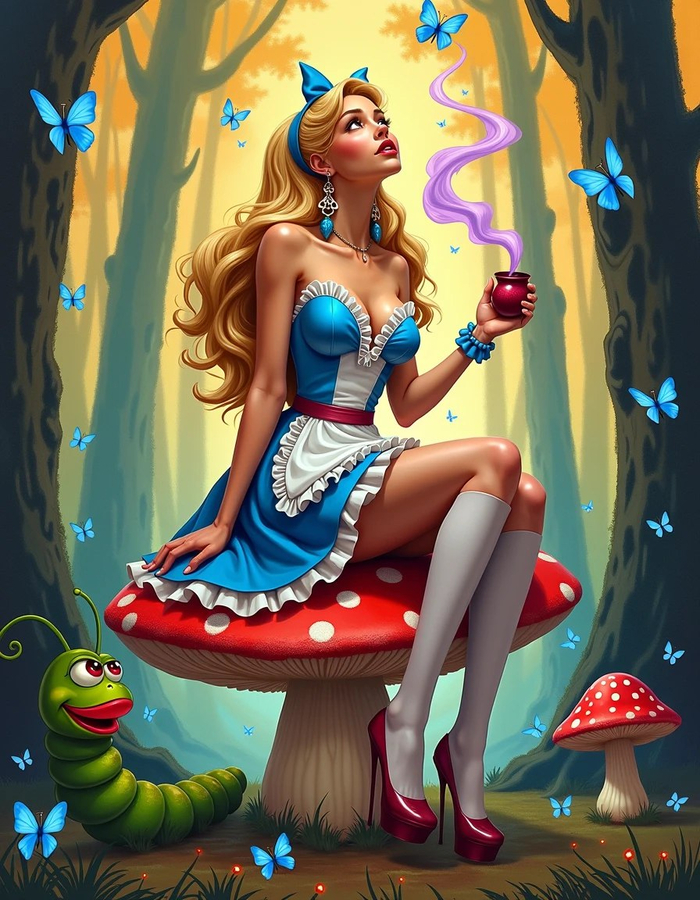 A masterpiece, energetic, vibrant full-color in the style of the 1980s, with bold lines, dynamic strokes and rich textures, on a warm background with a touch of nostalgia, perhaps with subtle drawings inspired by cellulose and vintage, worn textures similar to paper,oil painting, heavy brushstrokes, paint drips. A young, fair-skinned woman, likely in her early twenties, is centrally positioned, embodying a suggestive rendition of Alice from "Alice in Wonderland." She has long, flowing blonde hair, full lips, and is gazing upwards with a contemplative expression. She wears a low-cut, blue and white dress with a short skirt, white thigh-high stockings, and frilly white accents. She is seated atop a large, red and white spotted mushroom. She holds a small, red pipe in her hand, from which purple smoke is billowing. To her left, a large, cartoonish green caterpillar with red eyes and a protruding tongue is present. The environment is a stylized forest scene with tall, dark trees and numerous blue butterflies fluttering around. The lighting is soft, creating a dreamlike and slightly surreal atmosphere. The perspective is slightly from a low angle, emphasizing the woman and the mushroom. The image is a fantastical and vibrant illustration with strong colors and exaggerated features.