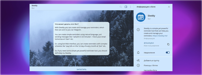 Напоминающий помощник для встреч и важных дел. Чтобы настроить уведомления, выберите часовой пояс, сообщите или напишите боту о том, что хотите напомнить, и укажите время. Вы можете сделать это в любом формате, например, «позвоните маме через 20 минут» или «тренировка в 18:00 каждую среду».