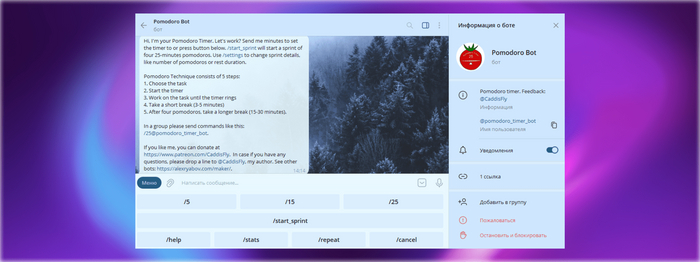 Специальный бот для концентрации внимания, который помогает работать или учиться по методу помидора. После запуска он начинает спринт из четырёх 25-минутных периодов концентрации с перерывами по 5 минут. Вы можете настроить количество таких «помидоров», время сосредоточения и время отдыха.