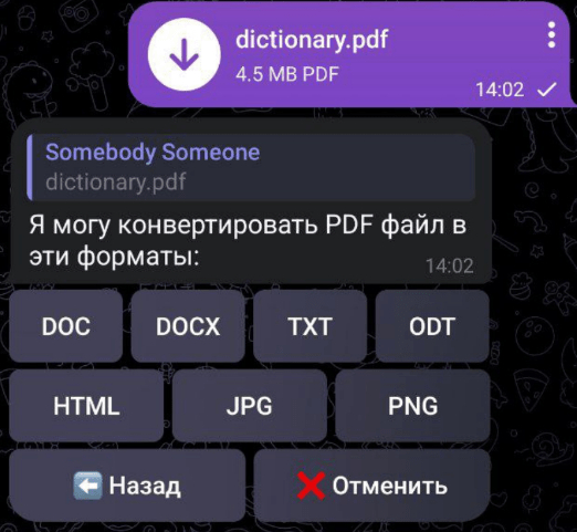 После этого бот предложит выбрать качество или формат, а затем пришлёт ссылку для скачивания выбранного файла. Всё происходит быстро и просто, без необходимости устанавливать дополнительные программы.