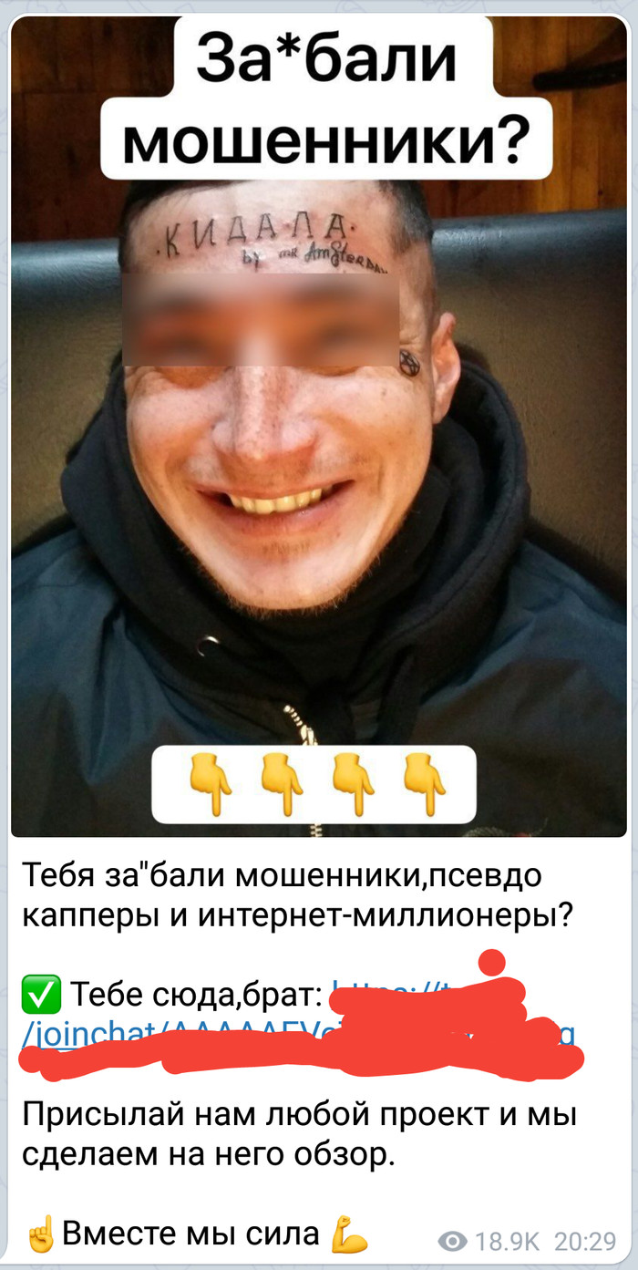 В общем и целом просто хотел предупредить, что появился подобный скамер, закупающий активно рекламу в других тг каналах и постепенно набирающий популярность. Если вам не в падлу, то можете кинуть жалобу на этот канал.
