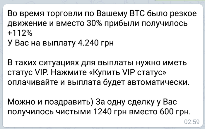 Здравсте, вроде на лохотрон раньше не попадался, но тут такая интересная схема, что решил подарить таки деньги. В скринах цифры в украинских гривнях, для простоты понимание 1грн близко 3рублей. Пост пилю в ознакомительных целях, что верить в интернете никому нельзя) Итак наткнулися на рекламу паблика в телеграме