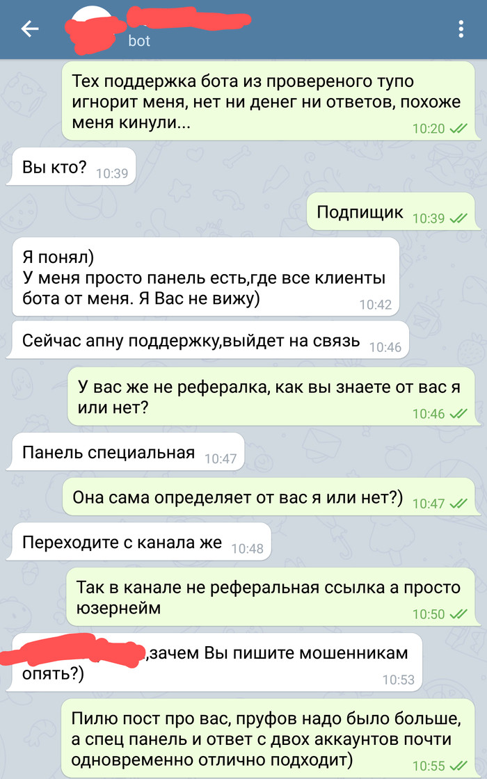 Кстати забанили мои 2 аккауны, а бот зароботка и переписку удалили. Тут все понятно, бот зароботка и бот проверяльщика отписывает почти в тоже время, стиль письма почти идентичный, это наверное один и тот-же человек. Вот так пришла беда откудо не звали, скринов с переписки больше, но решил не делать очень длиный пост. Деньги не вернуть а плохих не наказать, хочу только предупредить что в интернете никому верить нельзя, и даже паблики которые находят кидал, сами есть кидалами)