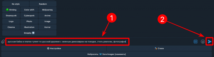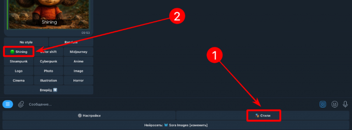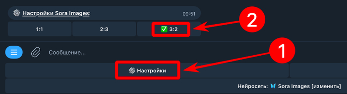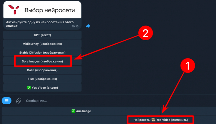 Для следующего эпизода нам нужен новый стартовый кадр, поэтому возвращаемся к Sora Images. Необходимо уметь переключать нейросети в Yes Ai Bot через нижнее меню.