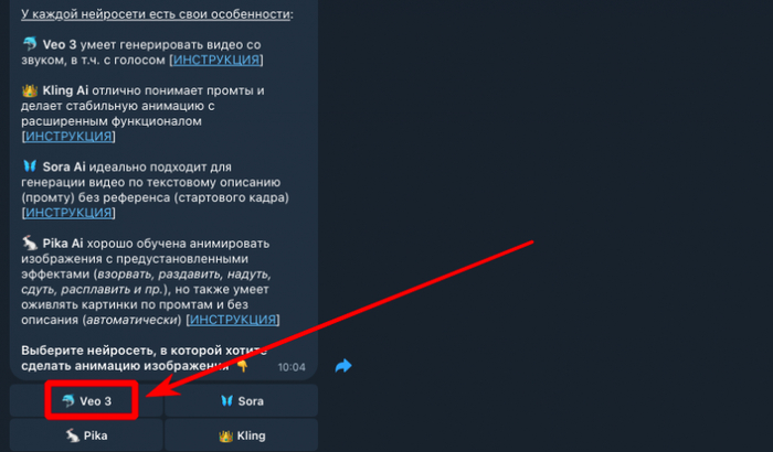 Переходим в чат-бот Veo 3 (чаще всего после предыдущих действий у вас всё ещё работает Sora Images, поэтому воспользуйтесь переходом по ссылке https://t.me/yes_ai_bot?start=_veo).