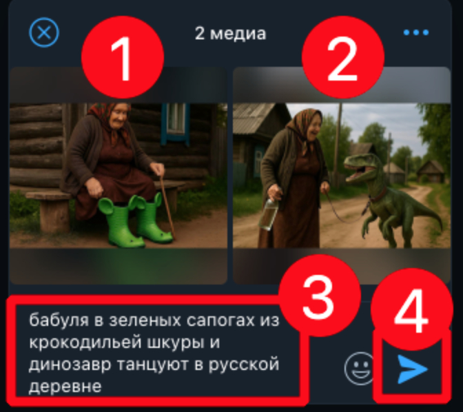 Загружаем в бота самую первую анимированную картинку, созданную на третьем этапе. Её удобно скопировать непосредственно из исходного файла и отправить боту вместе с текстовым описанием того, что должно быть изображено в первом кадре будущего ролика.