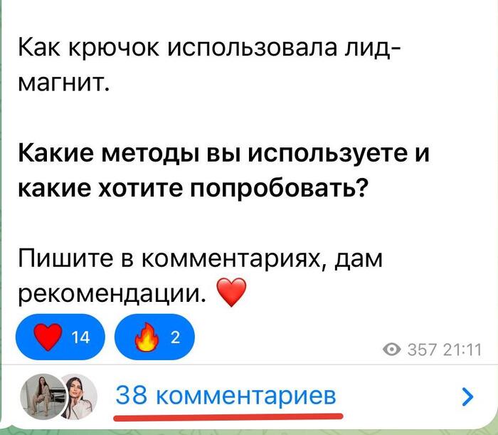 В Телеграм у меня есть папка с чатами по нетворкингу. Ее собираю уже на протяжении пары лет и она постоянно генерирует мне клиентов и подписчиков. Время от времени раскидываю визитку о себе. С 1 чата приходят в среднем 2-4 человека. Чаще всего аудитория с таких чатов приходит и сразу уточняет про услуги. Когда занималась сторонними проектами по продвижению в Телеграм это был один из основных источников клиентов. Так я получила первого клиента на 60 000 рублей. Продюсер написала мне в личку после публикации визитки в чате. Мы созвонились, обговорили детали и предоставила отзывы. На следующий день они отправили мне предоплату в 30 000 рублей. Кто-то скажет, что 60 000 рублей это не миллионы и даже не сотни тысяч, зато это реальные, а не выдуманные цифры, коих 90% в интернете.