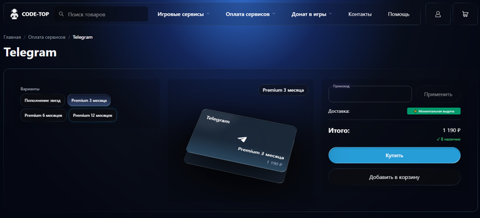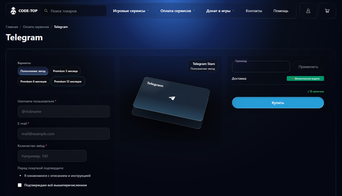 Один из таких сервисов — Code-top.shop. Здесь можно купить звезды телеграм в любом количестве: сам указываешь нужное число Stars, сразу видишь сколько стоит звезда в телеграм до оплаты.