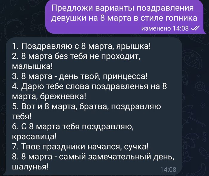 Появилась мысль попросить ChatGPT придумать за меня поздравление девушке на 8 марта, ибо креатива мне совсем не хватало что-либо придумать.