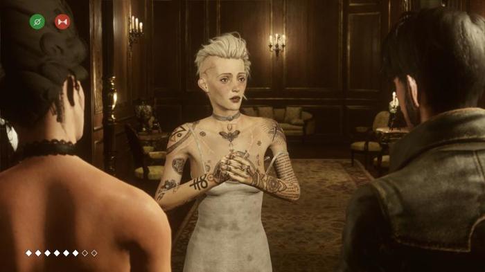 Ага, не ослышались. Разработчики присобачили в интерактивный квест немного эРПоГэ. У персонажа есть характеристики, которые можно и нужно прокачивать, чтобы получить доступ к диалогам и действиям. Даже больше - игруна подбивают встать на гиблый путь переигрывания, чтобы прокачать другие характеристики и посмотреть на другие вариации. Очков характеристик дают крайне по-жлобски, поэтому и умным, и красивым одновременно быть не получится.