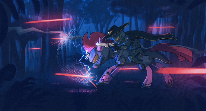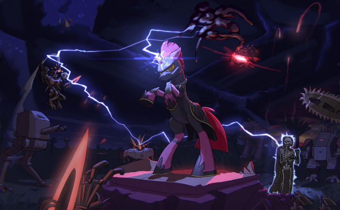 Сегодня у нас - слияние самой крутой, самой грозной, самой пугающей, самой безрогой единорожки Тэмпест Шэдоу и самой начитанной, самой ученной, самой дружелюбной и самой домоседной аликорночки Твайлайт Спаркл. Имени у слияния нету, так что ты можешь придумать его сам, Анон!