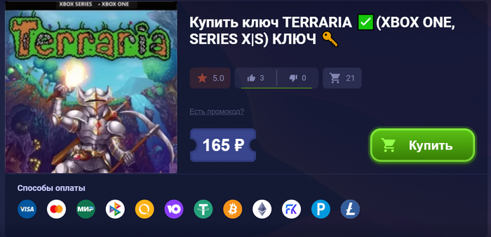 Переходим в категорию Terraria и ищем товар, также, как и в предыдущем способе смотрим на его критерии, внимательно читаем описание и оплачиваем.