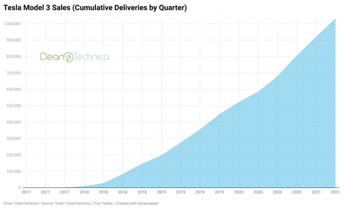 Хотя данные не являются официальной статистикой, портал Clean Technica собрал сводные сведения о продажах за все прошедшие годы. Только во втором квартале 2021 года было продано порядка 225 000 экземпляров Model 3, по некоторым оценкам, миллионная отметка была пройдена в июне текущего года.