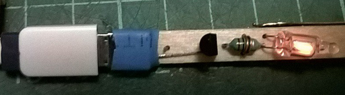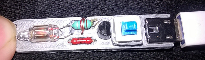 Тут большая катушка была заменена на индуктивность в 1mH. А первичная катушка сделана в виде маленькой проволочки, делающей один оборот и ещё половину. Больше/меньше нельзя, переставало работать. Сопротивление заменено на 15К. Неоновая лампочка подключена одним концом к свободному выходу индуктивности. Насколько я понимаю, в данной конфигурации, магнитного поля откровенно недостаточно для зажигания лампочки. Питание 5 вольт.
