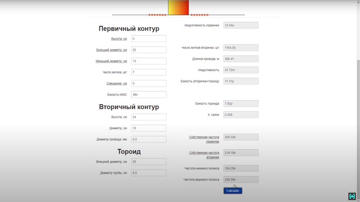 И так, допустим вы намотали что попало, как попало и на чём попало. Всё что нам сейчас понадобится - это линейка. В программе для расчета трансформаторов Тесла вводим измеренные параметры, такие как: высота намотки, диаметр каркаса трубы и диаметр провода. Указываем внешний диаметр тороида и диаметр трубы.