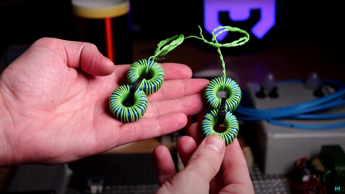 Теперь желтые кольца. Сердечник тут выполнен из распыленного железа обладающей большой индукцией насыщения и низкой магнитной проницаемостью. При подключении к драйверу он в буквальном смысле вызывает короткое замыкание. Сигнал просаживается, ток потребления от блока питания вырастает до небес, феррит сильно нагревается. Такой материал применим исключительно в сглаживающих дросселях, дифференциальных сетевых фильтрах и других индуктивных элементах.